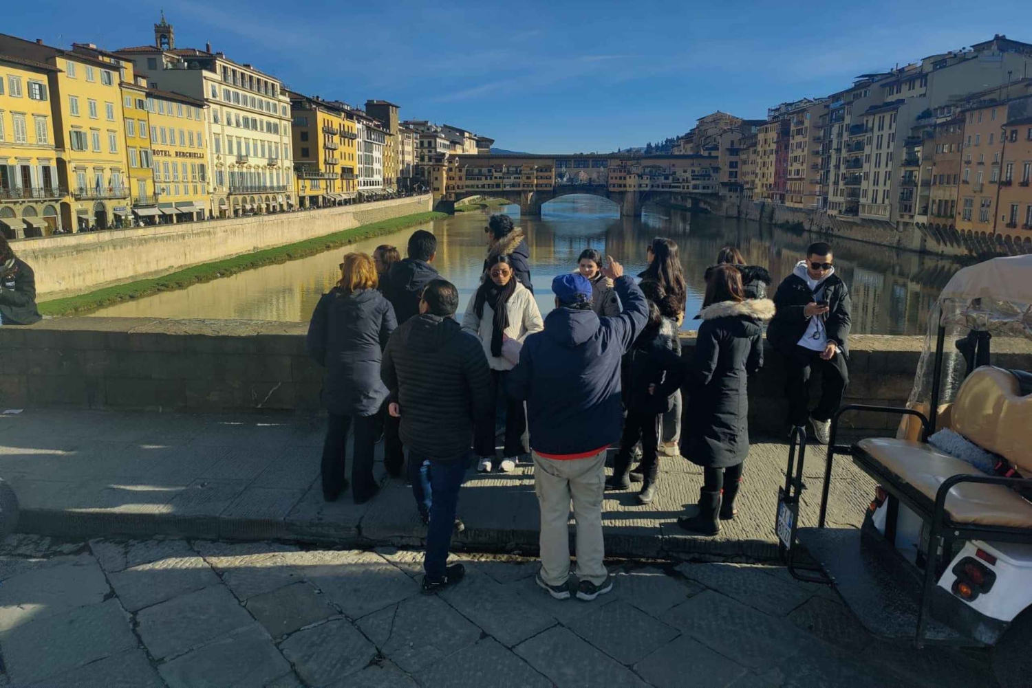 Besøg de vigtigste florentinske seværdigheder såsom Duomo, Palazzo Vecchio, Uffizi og meget mere med denne private tur i en elektrisk golfvogn. Sus gennem de charmerende og maleriske gader i Firenze, undgå folkemængderne og stop, når du har lyst. Hør historier og fakta om byens højdepunkter, herunder Ponte Vecchio, Palazzo Pitti og meget mere fra den audioguide, der følger med din golfvogn. Mod et ekstra gebyr kan du se Piazzale Michelangelo og beundre det spektakulære panorama. Bare spørg din chauffør, hvis du ønsker at tilpasse din tur, så viser han dig gerne dine foretrukne steder. Hvis din tur finder sted sidst på eftermiddagen, kan du booke en ekstra særlig oplevelse, herunder en aperitif ved solnedgang. Vend tilbage til dit udgangspunkt, når turen er slut.Includes