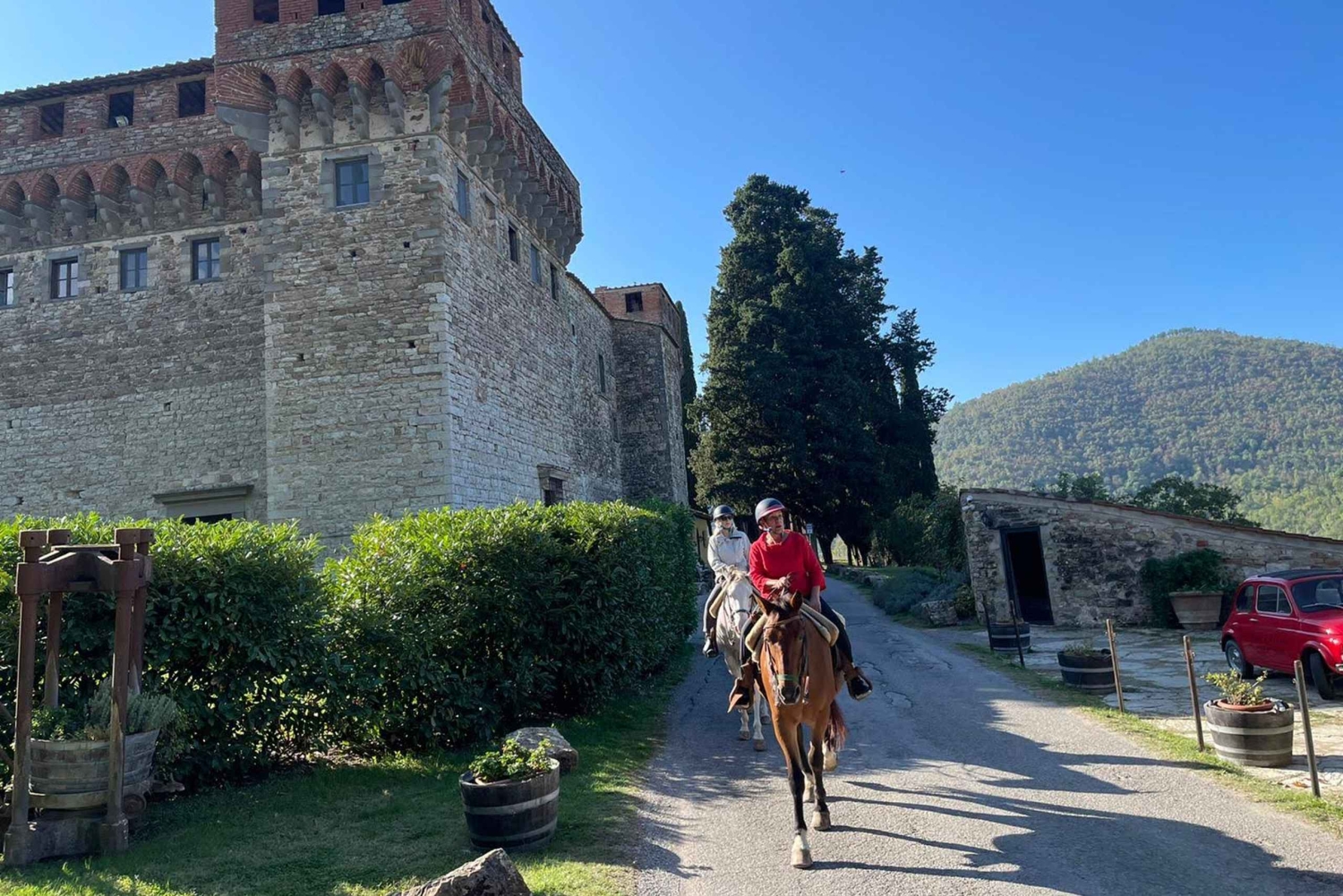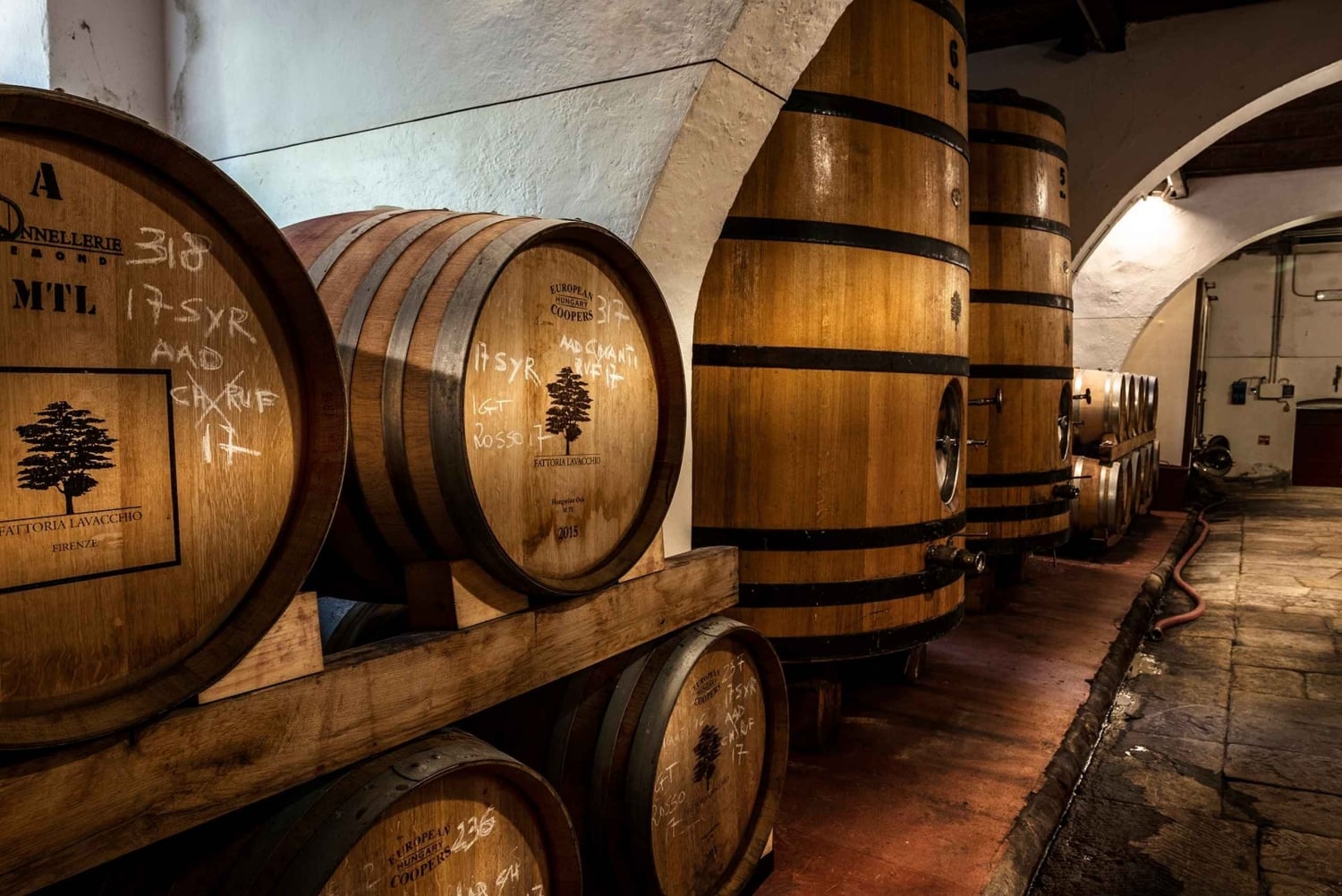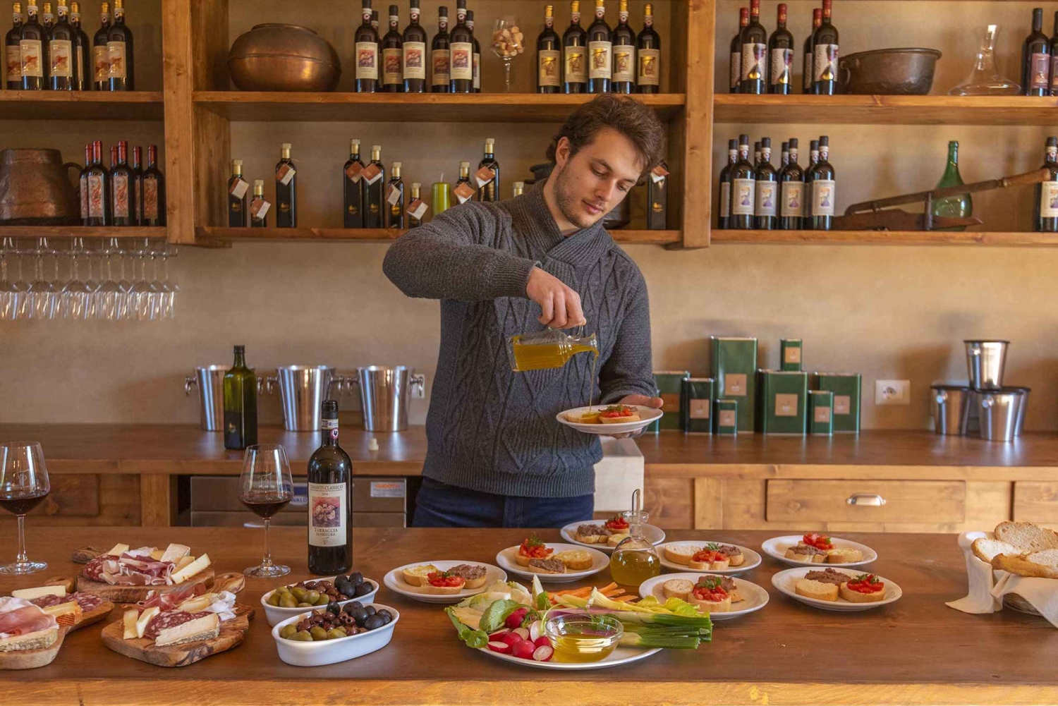Nach der Rückkehr zum Reitzentrum wirst du mit dem Auto zu einem historischen Chianti-Edelweingut gebracht, das von eigenen Weinbergen umgeben ist, um die Tour zu machen. Dazu gehört eine geführte Besichtigung des Anwesens, der alten Weinkeller und der Vinsantaia. Du bekommst ein leichtes Mittagessen serviert, eine typische Auswahl an Vorspeisen, Aufschnitt, Pecorino-Käse und Bruschetta, begleitet von vier preisgekrönten Chianti und Super Tuscan Weinen und einem extra nativen Olivenöl des Weinguts.