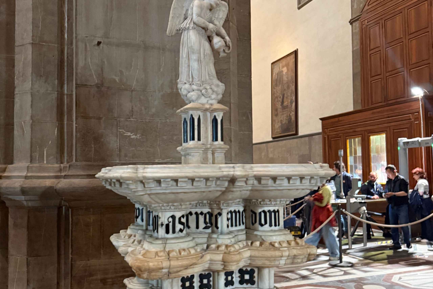 Astu Firenzen sydämeen Firenzen Duomo-katedraalin sisäänpääsyn ja audio-oppaan avulla, joka on luotu matkailijoille, jotka haluavat sekä mukavuutta että kulttuuria. Nauti varatusta ryhmäpääsystä Santa Maria del Fioreen, joka on yksi maailman suurimmista goottilaisista ja renessanssiajan mestariteoksista. Sisällä voit ihailla Brunelleschin legendaarista satamaa ja Vasarin henkeäsalpaavaa freskoa 'Viimeinen tuomio'. Kulje kauniissa sisätiloissa, joita koristavat monimutkaiset lasimaalaukset, marmorilattiat ja vuosisatoja vanhat mosaiikit. Ihaile kultaisia mosaiikkeja ja Ghibertin Paratiisin portteja. Tutustu Firenzen varhaisimman kristillisen kirkon jäänteisiin ja Michelangelon, Donatellon ja Ghibertin alkuperäisiin teoksiin, jotka on säilytetty lähellä niiden luomispaikkaa. Paranna vierailuasi monikielisellä audio-opassovelluksella (saatavilla englanniksi, italiaksi, espanjaksi, ranskaksi, saksaksi, portugaliksi, kiinaksi ja japaniksi), joka paljastaa kunkin monumentin kiehtovan historian, arkkitehtuurin ja symboliikan. Tärkeää tietoa Pääsy: Huomaa, että sisäänpääsy katedraaliin on yleisön sisäänkäynnistä ja että kaikille vierailijoille tehdään pakollinen turvallisuustarkastus. Ryhmäpääsy: Tämä on ryhmäpääsy, ei yksittäinen lippu. Vieraat pääsevät sisään isäntämme kanssa näyttämällä QR-koodin portilla olevalle turvallisuushenkilöstölle. Ryhmäsisäänpääsy Firenzen katedraaliin (Duomo) Isännän avustama sisäänkirjautuminen Englanninkielinen liveopas englanninkielisille vieraille .Ääniopassovellus muille kielille Sisäänpääsy hoidetaan osana ryhmäelämystä, ei yksittäisenä varattuna lipuna Audio-opas: Ota omat kuulokkeet mukaan, jotta voit käyttää älypuhelimesi audio-opasta. Tarjoamme englanninkielisille vieraille kuulokkeet, jotta kuulet englanninkielisen oppaan selvästi kierroksen aikana. Kaikille muille kielille käytä omia kuulokkeita audio-opassovelluksemme kanssa.Includes