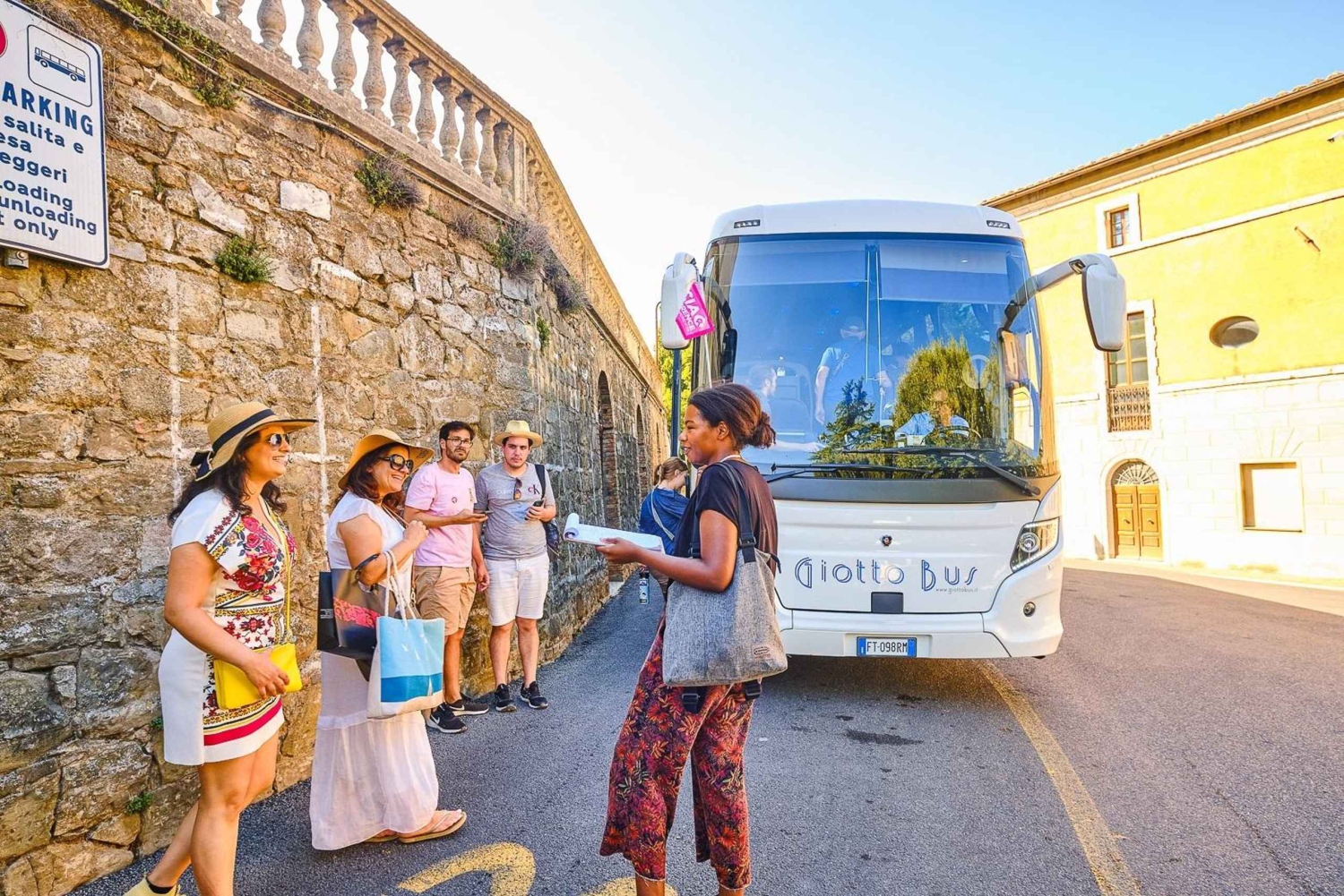 Tutustu Toscanan keskiaikaisiin kyliin tällä koko päivän kestävällä opastetulla retkellä Firenzestä. Tutustu Pienzan historialliseen keskustaan ja Montalcinon linnoitukseen. Nauti gourmet-lounaasta ja kolmesta viininmaistiaisesta Brunellon temppelissä. Tutustu Sant'Antimon luostariin audio-oppaan johdolla ja Palazzo Pubblicoon. Aloita kierros Pienzasta, jossa sinulla on vapaata aikaa tutustua renessanssin ensimmäiseen ihannekaupunkiin. Tutustu historialliseen keskustaan Piazza Pio II:lta, Santa Maria Assuntan katedraaliin ja Palazzo Piccolominiin. Jos valitset vaihtoehdon Palazzo Pubblico, astu sisään priorien entiseen asuinpaikkaan. Suuntaa Montalcinoon, joka on täydellisesti säilynyt keskiaikainen kaupunki, jossa on massiivinen linnoitus. Aloita Sant'Agostinon entisestä luostarista, jossa on nykyään interaktiivinen Brunellon temppeli -museo. Tutustu paikalliseen historiaan ja kulttuuriin ja tutustu kuuluisan Brunello di Montalcino -viinin tuotantoon. Viimeistele vierailu maistelemalla kuuluisaa toscanalaista Brunelloa ja lounaalla Brunellon temppelin luostarissa. Anna kokin luovuuden inspiroida sinua, kun makujen räjähdysmäinen räjähdys yhdistyy täydellisesti Toscanan parhaiden viinien rikkauteen. Päätä seikkailusi vierailemalla Sant'Antimon luostarissa, benediktiiniläiskirkossa, jonka legendan mukaan Kaarle Suuri perusti yhdeksännellä vuosisadalla. Tutustu vehnäpeltojen, ikivanhojen oliivipuiden ja viinitarhojen ympäröimälle maisemalliselle aukiolle. Nostakaa viimeinen lasillinen päivän seikkailuille ennen paluuta Firenzeen.Includes