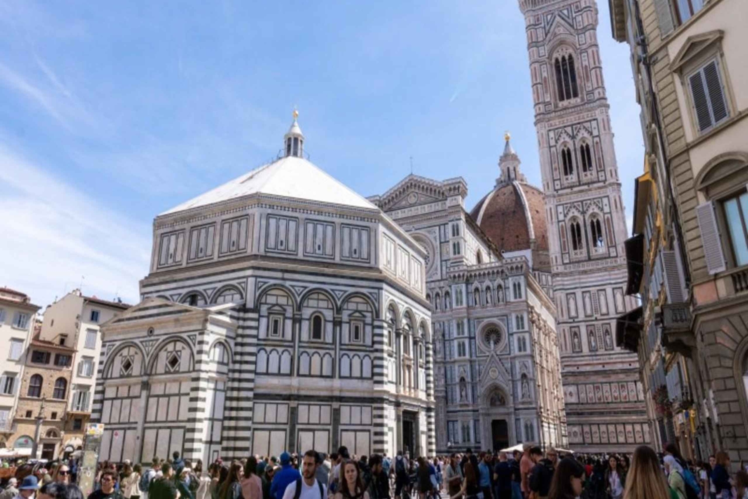 Inizia la tua mattinata all'interno della Galleria dell'Accademia, dove i biglietti prenotati in anticipo ti consentono di entrare direttamente per vedere il David di Michelangelo, un simbolo imponente di sfida e genio. Mentre la tua guida ti svela la storia della statua, esplorerai anche sculture incompiute e altre opere rinascimentali che rivelano il ruolo di Firenze come motore della rivoluzione artistica. Poi, parti per un tour a piedi nel cuore della città. Da Piazza della Repubblica al Ponte Vecchio, ogni tappa aggiunge profondità al passato stratificato di Firenze. Scopri perché un cinghiale di bronzo attira infiniti lanci di monete, come Piazza della Signoria è diventata un palcoscenico per giochi di potere politico e perché i ponti medievali sono ancora importanti nella Firenze moderna. La tua ultima tappa è il Duomo di Firenze, dove ti aspetta una delle guide ufficiali del Duomo. All'interno, scoprirai come è stata costruita la cupola del Brunelleschi senza impalcature e cosa rivelano i pavimenti e le cappelle intricati sulla fede, il simbolismo e l'ambizione. Eviterai il solito caos dei biglietti e avrai una visione privilegiata dell'edificio più iconico di Firenze.Includes