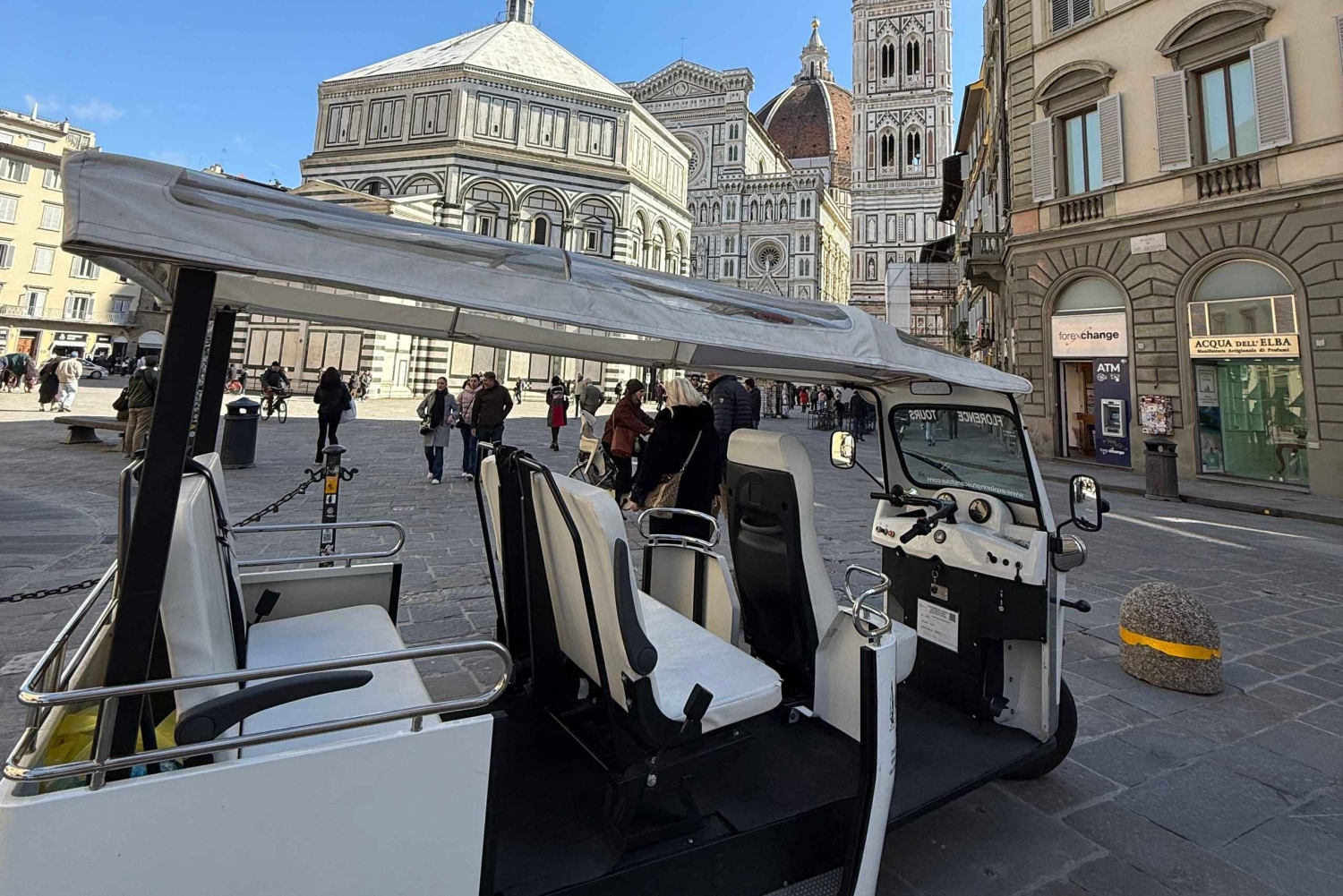 電気トゥクトゥクまたはゴルフカートに乗り込み、フィレンツェをユニークでエコフレンドリーな方法で探検しましょう。街のベストスポットを巡りながら、ミケランジェロ広場周辺の素晴らしい丘陵地帯にも簡単にアクセスでき、街の絶景を堪能できます。 街の象徴的な広場を訪れ、アカデミア美術館とウフィツィ美術館、古い橋、有名なカフェ、大聖堂、そしてルネサンスの誕生地であるこの街の主要なスポットを巡ります。 ツアー終了後、現地ガイドがフィレンツェで他の見どころやアクティビティの提案を喜んでいたします。 魔法のようなフィレンツェの街をゴルフカートで巡る、忘れられないツアーにご参加ください!このユニークな体験では、ルネサンスの宝石と呼ばれるこの街の豊かな歴史、壮麗な建築物、活気ある文化を、歩く疲れなく探検できます。 ツアーの見どころ: 歴史的建造物: ブルネレスキが設計した壮麗なドームが特徴のフィレンツェ大聖堂(ドゥオモ)など、象徴的なスポットを滑るように通り過ぎます。 フィレンツェの政治の中心地であるパラッツォ・ヴェッキオを訪れ、中世の建築美を堪能してください。 アートと文化: 歴史上最も重要な芸術作品の一部を収蔵するウフィツィ美術館の外観に感動してください。 中世の石造りの橋で、ショップが並ぶポンテ・ヴェッキオで停車し、川の見事な景色と写真撮影の絶好の機会をお楽しみください。 魅力的な地区: 職人技の工房と本物のイタリアの魅力を誇るオルトラルノ地区へ足を踏み入れてみてください。 フィレンツェの絵のように美しい街並みをのんびり散策し、角を曲がるたびに隠れた名所を発見してください。 パノラマビュー: ミケランジェロ広場へ登ると、街のスカイラインを一望できる絶景が待っています。インスタグラムにぴったりの写真が撮れるスポットです。 現地の知識: 知識豊富なガイドが、フィレンツェの歴史、芸術、文化に関する興味深い物語やエピソード、洞察を共有し、ツアーを情報豊かで楽しいものにしてくれます。 フィレンツェのゴルフカートツアーは、街をユニークで楽しい方法で体験できるツアーです。今すぐツアーを予約し、フィレンツェの美しさに魅了されてください!Includes