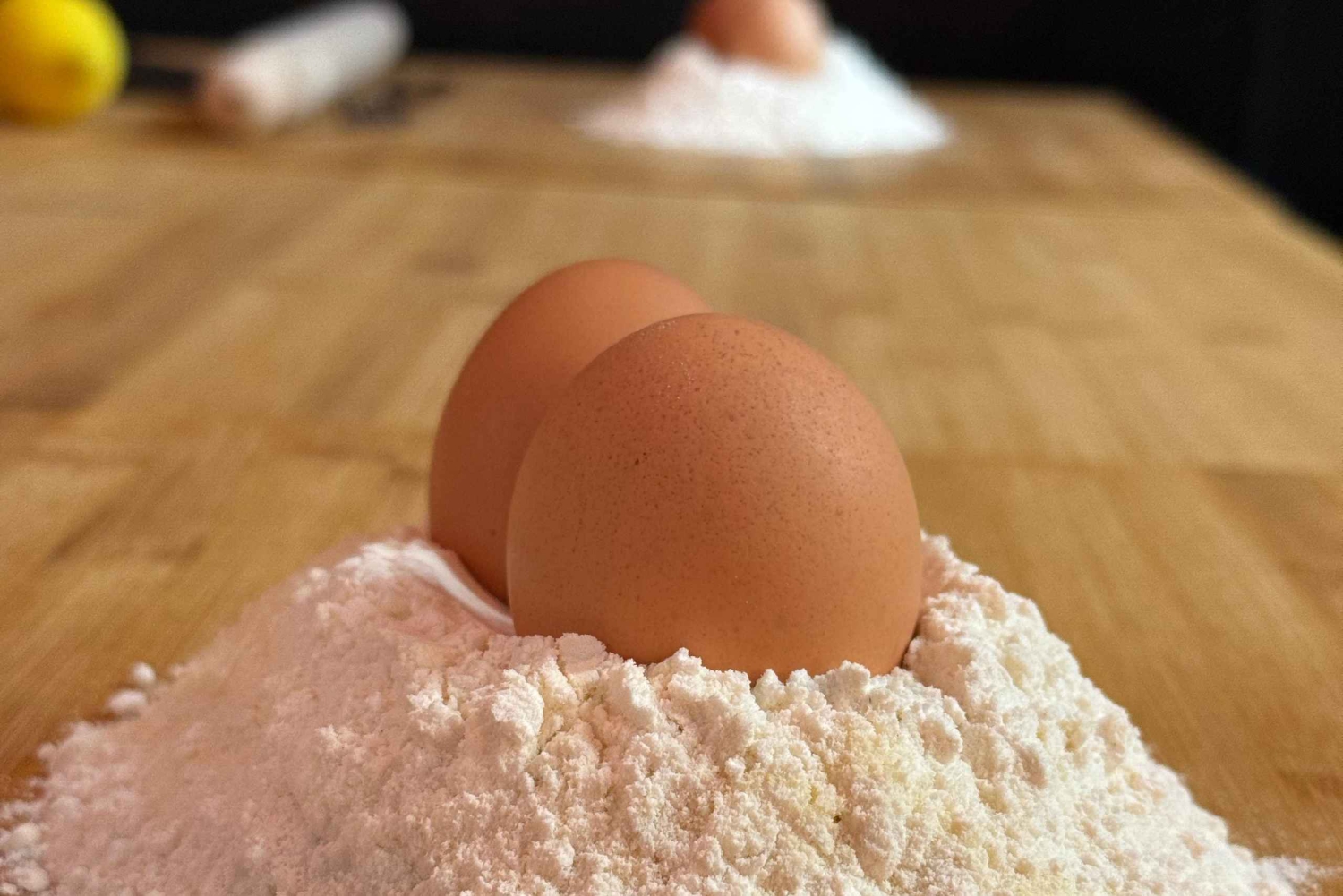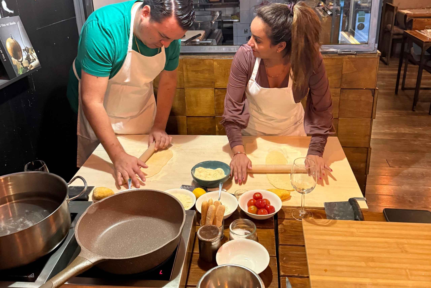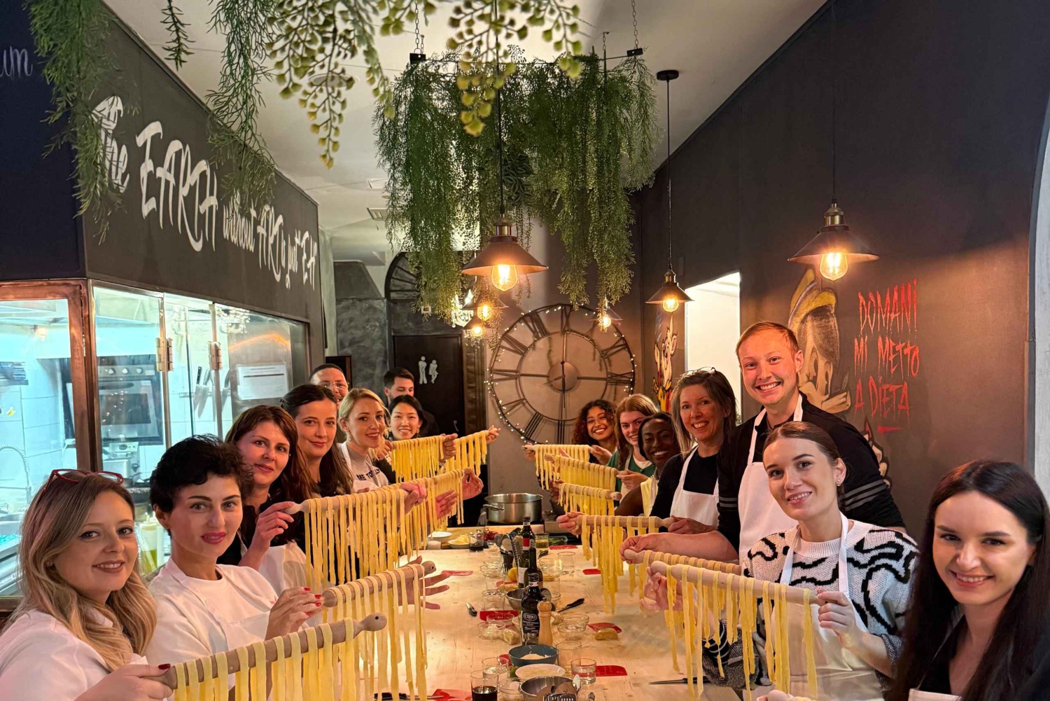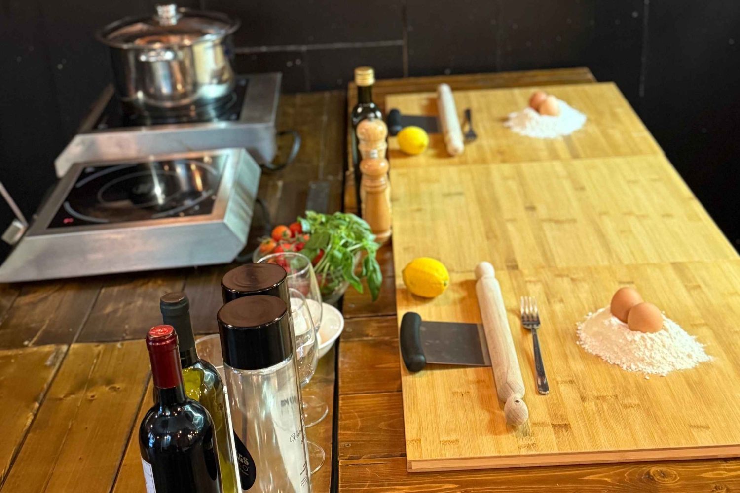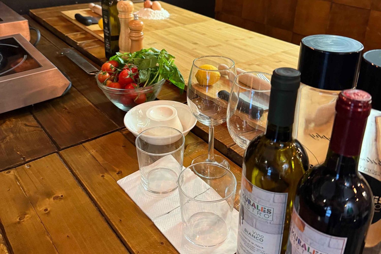 Vi lager en introduksjon og en oppsummering av alt vi skal gjøre; vi koker sammen to typer pasta på tradisjonelt vis med bare hendene uten maskiner eller noe annet, vi forteller trinnene, vi tilbereder desserten sammen, og til slutt spiser vi alt sammen. I løpet av timen smaker vi også på to typer vin; rød og hvit. Det kommer ikke til å mangle på latter og moro....Includes