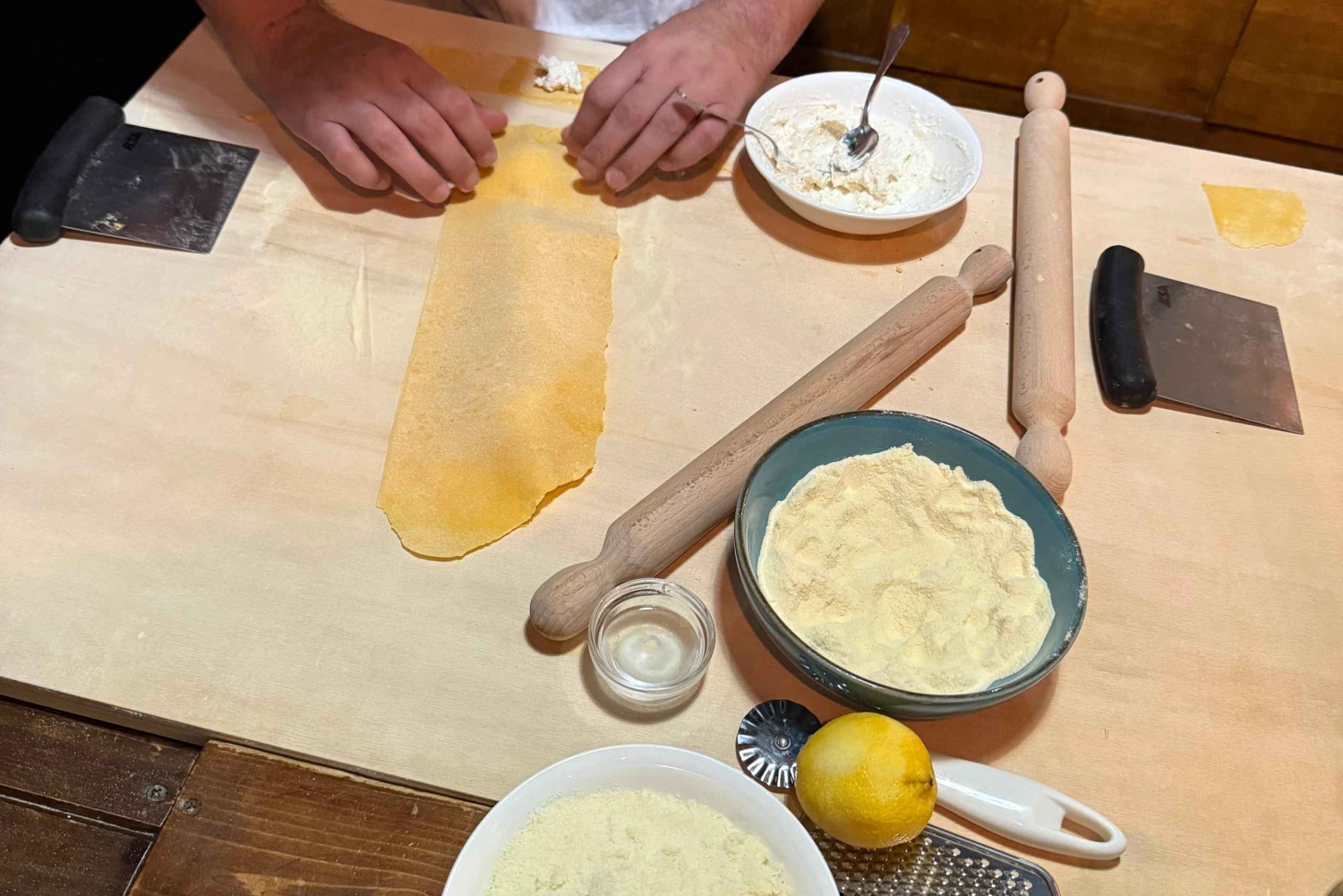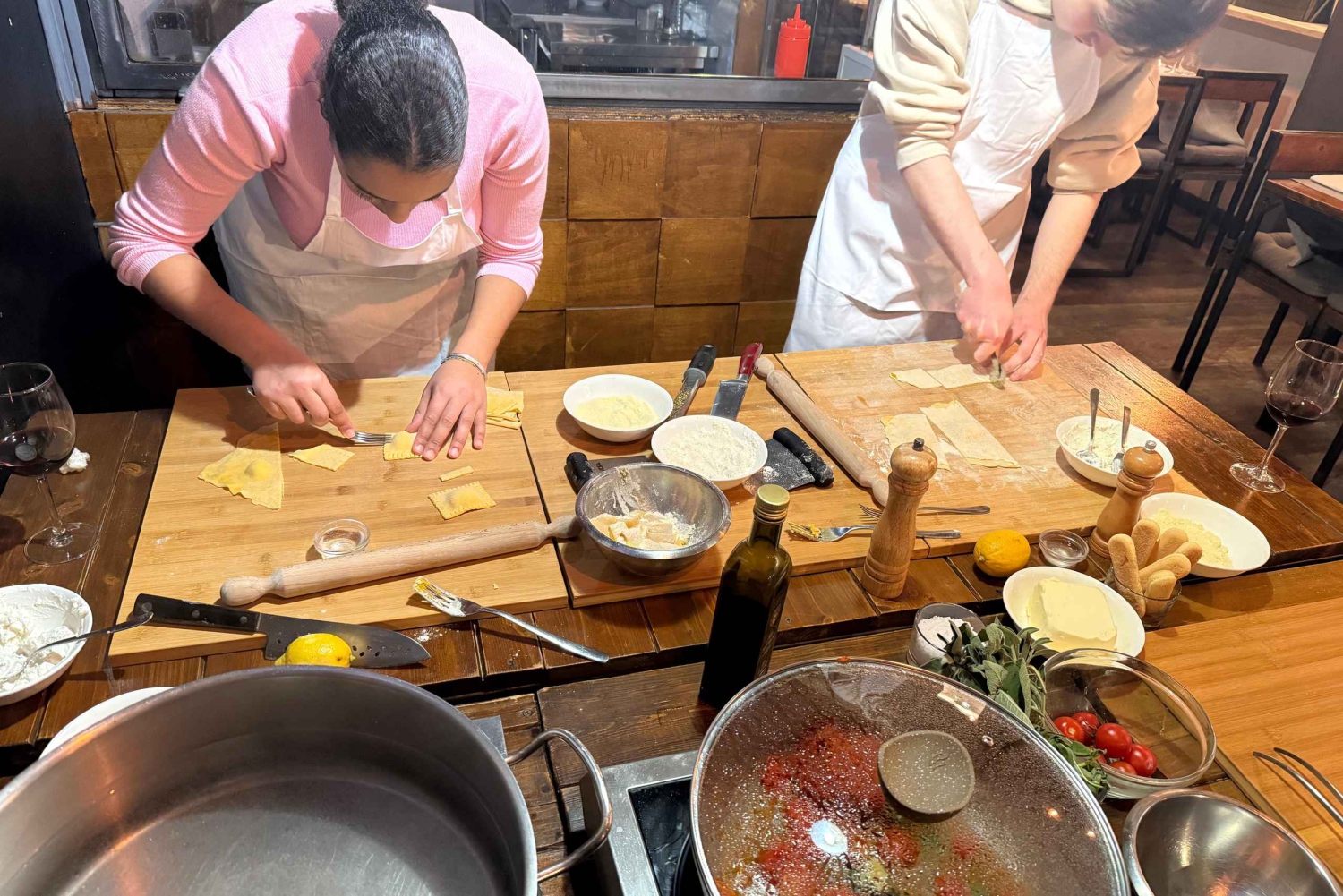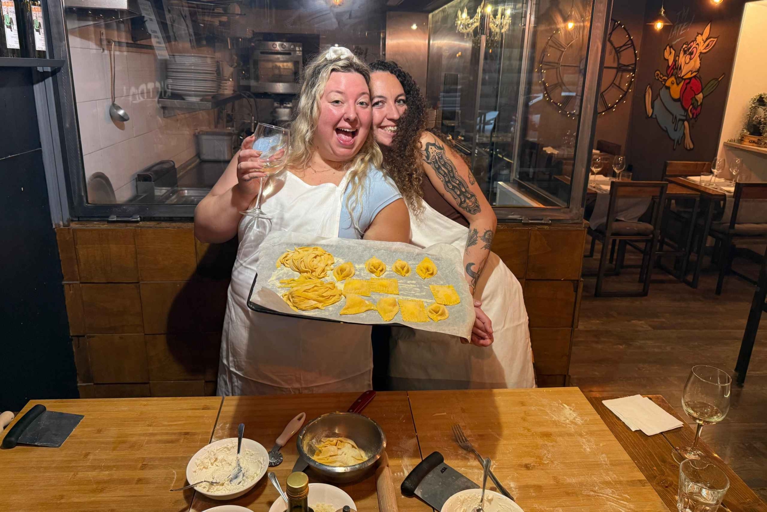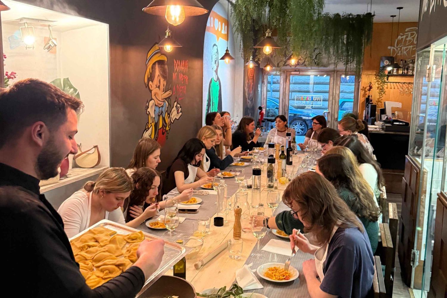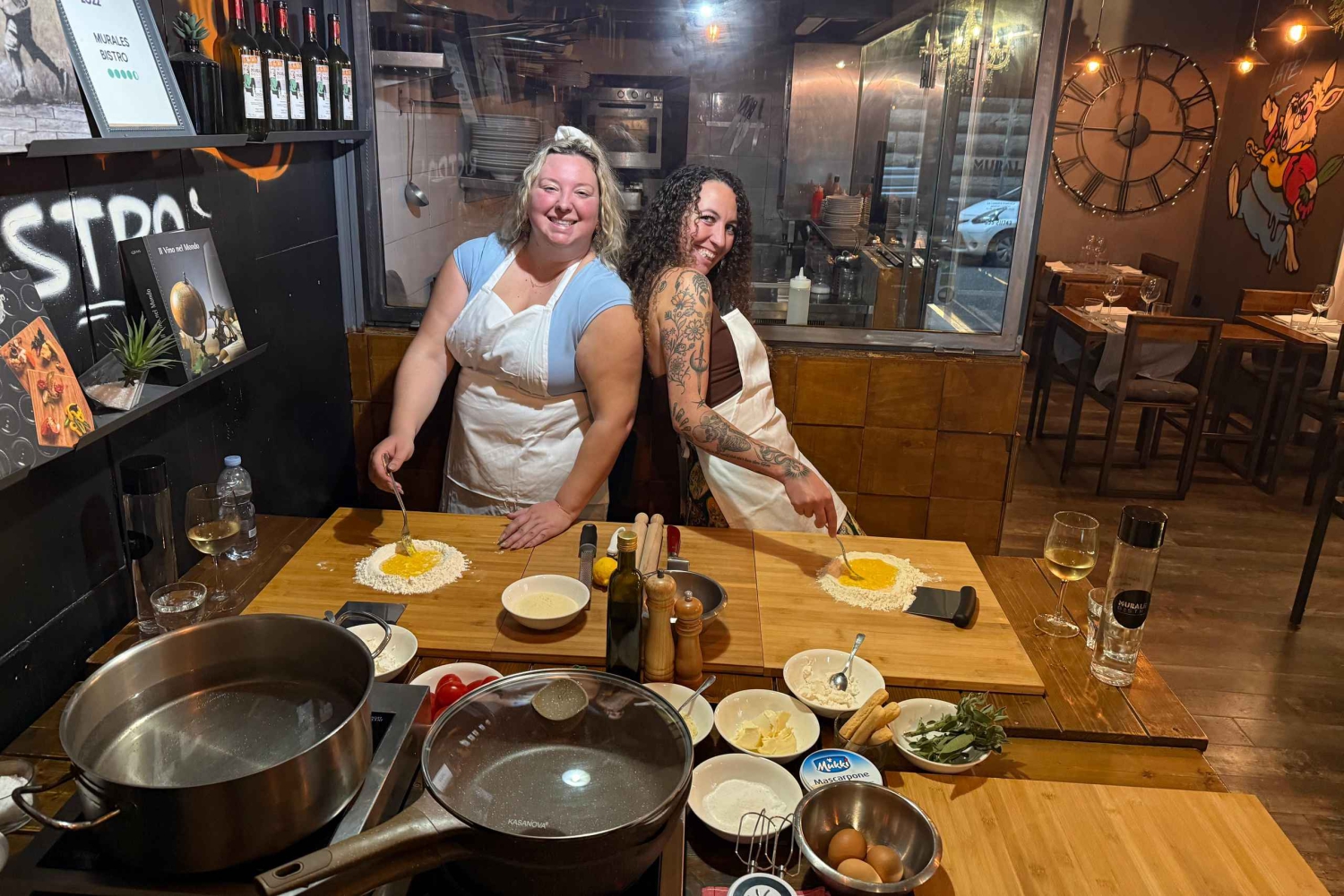 Vi lager en introduksjon og en oppsummering av alt vi skal gjøre; vi koker sammen to typer pasta på tradisjonelt vis med bare hendene uten maskiner eller noe annet, vi forteller trinnene, vi tilbereder desserten sammen, og til slutt spiser vi alt sammen. I løpet av timen smaker vi også på to typer vin; rød og hvit. Det kommer ikke til å mangle på latter og moro....Includes