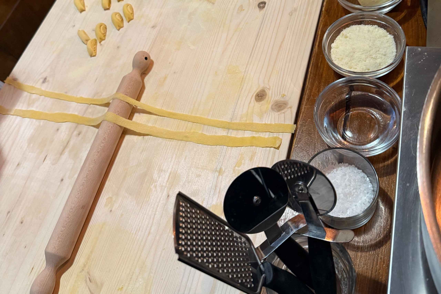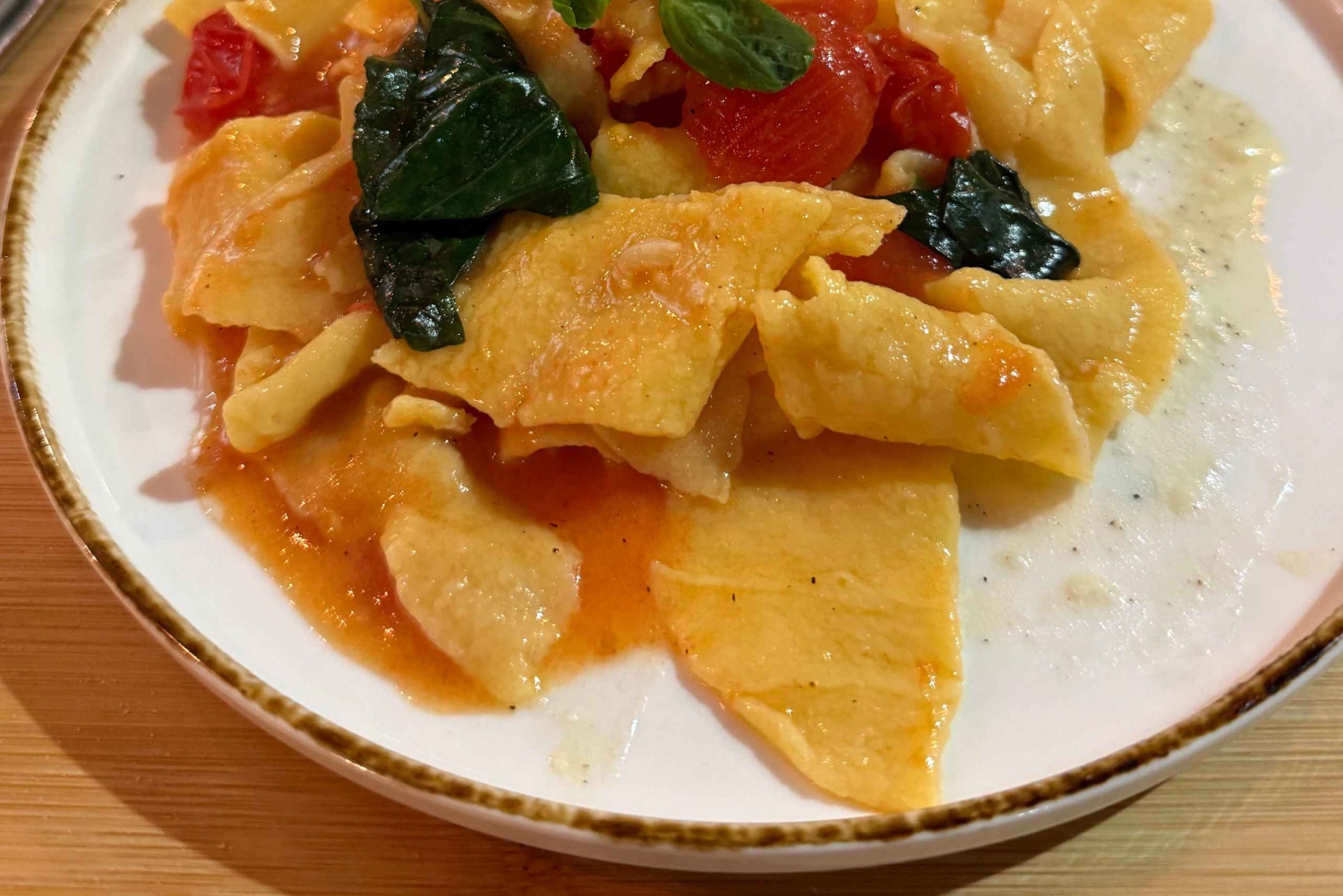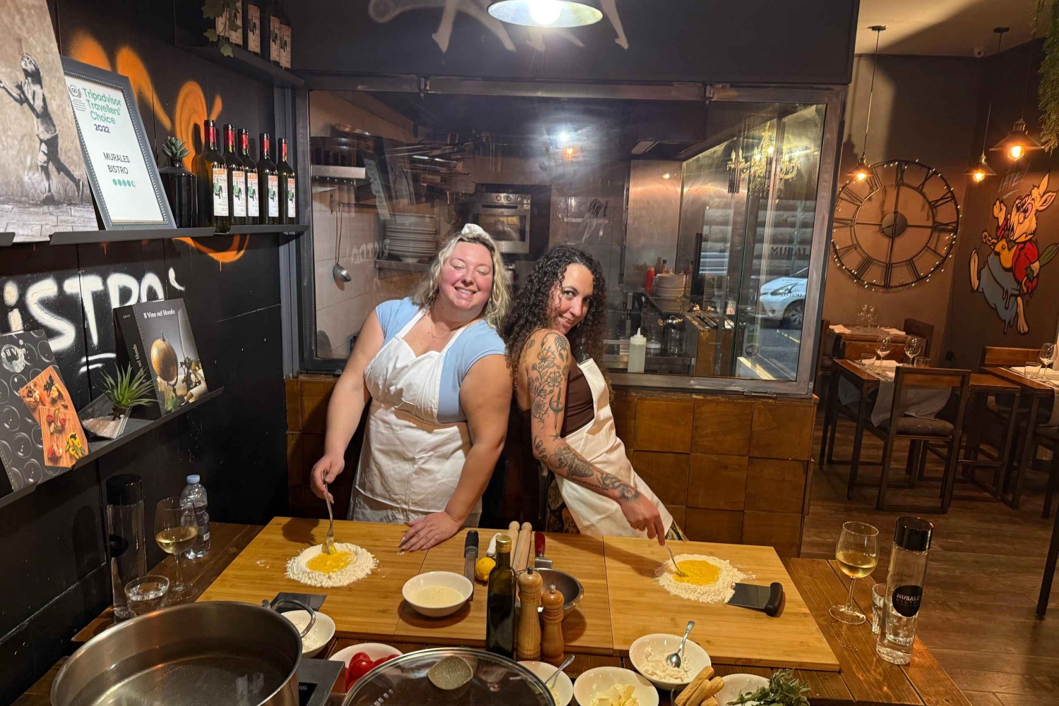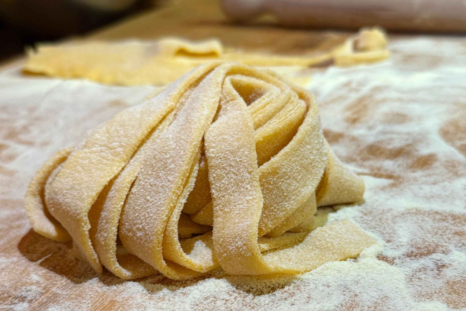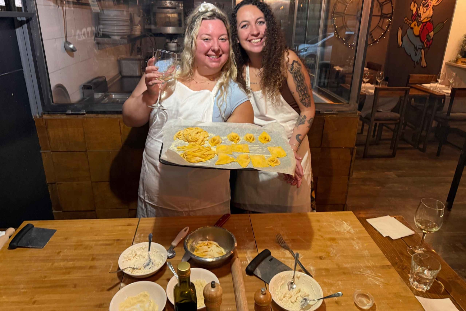 Vi lager en introduksjon og en oppsummering av alt vi skal gjøre; vi koker sammen to typer pasta på tradisjonelt vis med bare hendene uten maskiner eller noe annet, vi forteller trinnene, vi tilbereder desserten sammen, og til slutt spiser vi alt sammen. I løpet av timen smaker vi også på to typer vin; rød og hvit. Det kommer ikke til å mangle på latter og moro....Includes