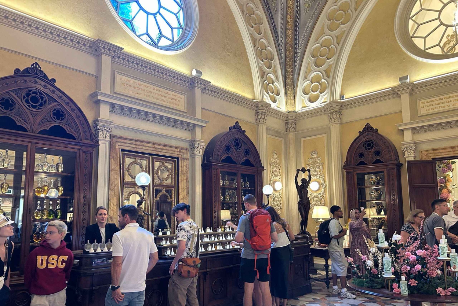 Den tre timer lange turen med historie og gamle lukter begynner på et av de viktigste og mest myteomspunne torgene i Firenze - torget Santa Maria Novella, som tidligere var åsted for mange feiringer og begivenheter. Høydepunktet på turen er den sjarmerende kirken Santa Maria Novella, med en fasade laget av Leon Battista Alberti som perfekt gjenspeiler renessansen, og som viser idealene for humanistisk arkitektur. Kirken har imidlertid en sterk gotisk stildominans, og dermed en balanse mellom begge stilartene og harmoni generelt. Turen fortsetter med å oppdage den enorme glamouren inne i kirken, som er inspirert av den klassiske epoken og den greske og romerske tiden med fantastiske mesterverk: Treenigheten av Masaccio med det berømte 'Jeg var en gang det du er, og det jeg er, skal du bli', krusifikset av Brunelleschi, Girlandaios fresker i Tardibuoni-kapellet og krusifikset av Giotto (den mest betydningsfulle florentinske kunstneren noensinne). En mindre kjent, men ikke desto mindre viktig del av turen er Santa Maria Novellas farmasøytiske verksted - det eldste i hele verden. Når du går gjennom en gammel dør, kommer du tilbake til 1300-tallet, en periode preget av prakt og rikdom. Det første rommet er fullt av lyse, søte parfymer som kiler i nesen. Blant de mest populære fornyede farmasøytiske produktene er Santa Maria Novellas vann, som i gamle dager ble kalt Anthysterical-vann, Medici-eliksiren og den røde brennevinet Alkermes. Velg mellom alle de ulike variantene og kjøp din egen magiske drik.Includes