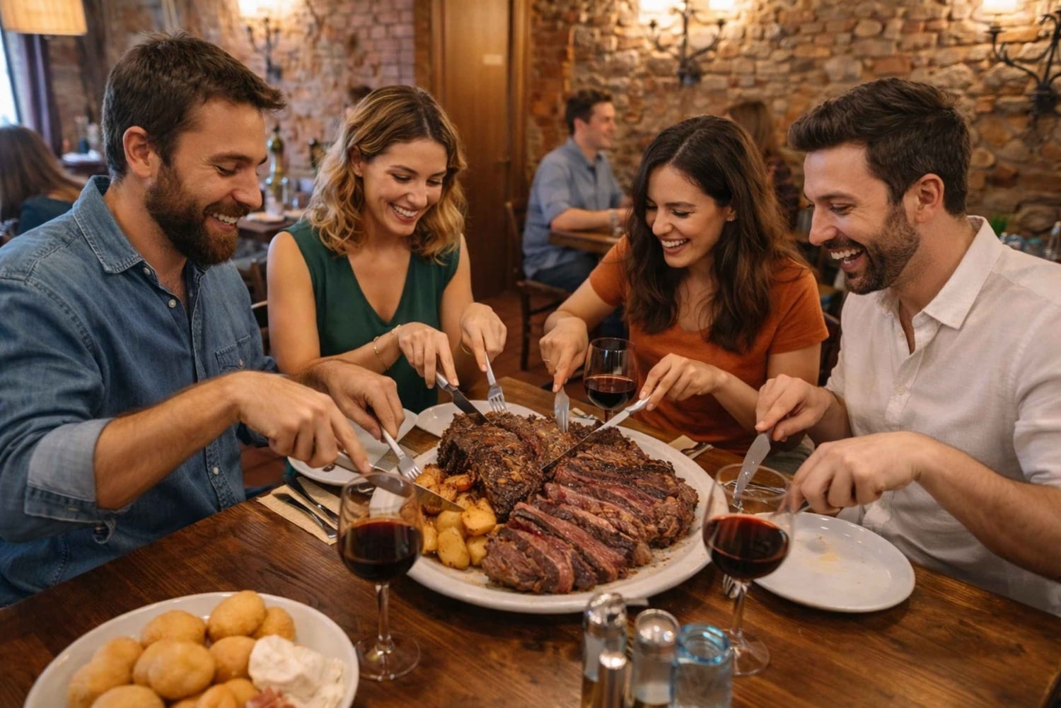 Njut av en strikt florentinsk kulinarisk upplevelse, med fokus på en av stadens mest ikoniska rätter: biff alla fiorentina. Middagen börjar med coccoli, traditionella florentinska friterade pastabollar, serverade med råskinka och stracchinoost, en klassisk kombination som är mycket älskad av florentinarna. Huvudrätten är en 1 kg florentinsk biff, grillad enligt tradition och serverad för att delas, tillsammans med bakad potatis. Köttet tillagas på ett enkelt sätt för att framhäva dess kvalitet, med full respekt för den autentiska florentinska stilen. Middagen åtföljs av två glas Chianti-vin per person, utvalda för att framhäva biffens rikedom. Upplevelsen äger rum i en traditionell florentinsk trattoria i Florens historiska centrum, i en avslappnad och autentisk atmosfär, där lokalbefolkningen fortsätter att njuta av den äkta toskanska maten. Denna fasta meny är perfekt för dig som vill uppleva en äkta florentinsk specialitet, njuta av högkvalitativa ingredienser och av en lugn middag, i traditionens och smakens tecken.Includes