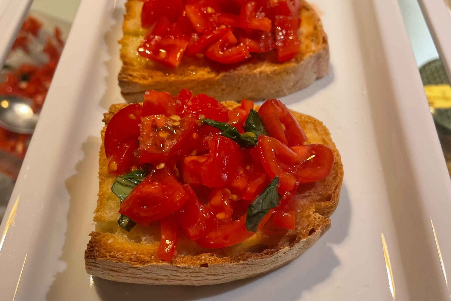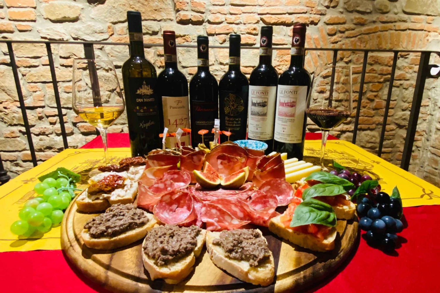 Officiell certifierad guide Vinprovning och vinparningsklass Tallrik med toskanska aptitretare inklusive italienska oliver, Bruschetta, Salami och Prosciutto Alkoholhaltiga drycker - sju typer av toskanskt vin För barnen inkluderar drycker Coca Cola, Fanta eller SpriteImportant Information